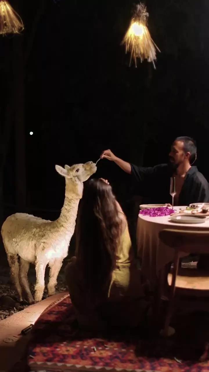 An intimate private dining setup inside the alpaca enclosure for up to 4 guests.